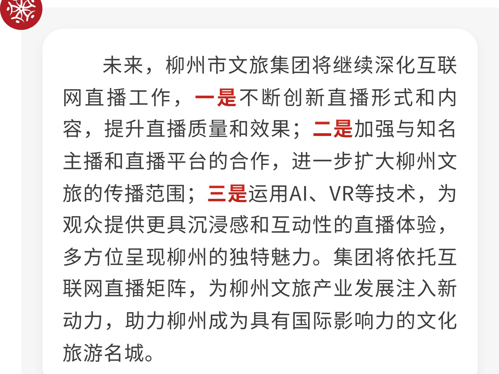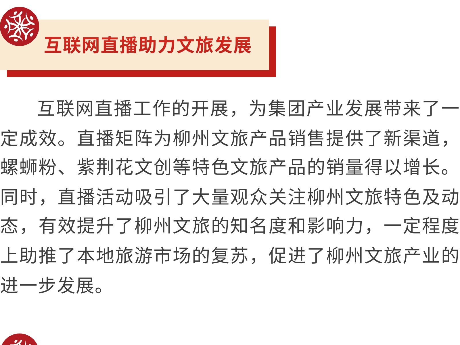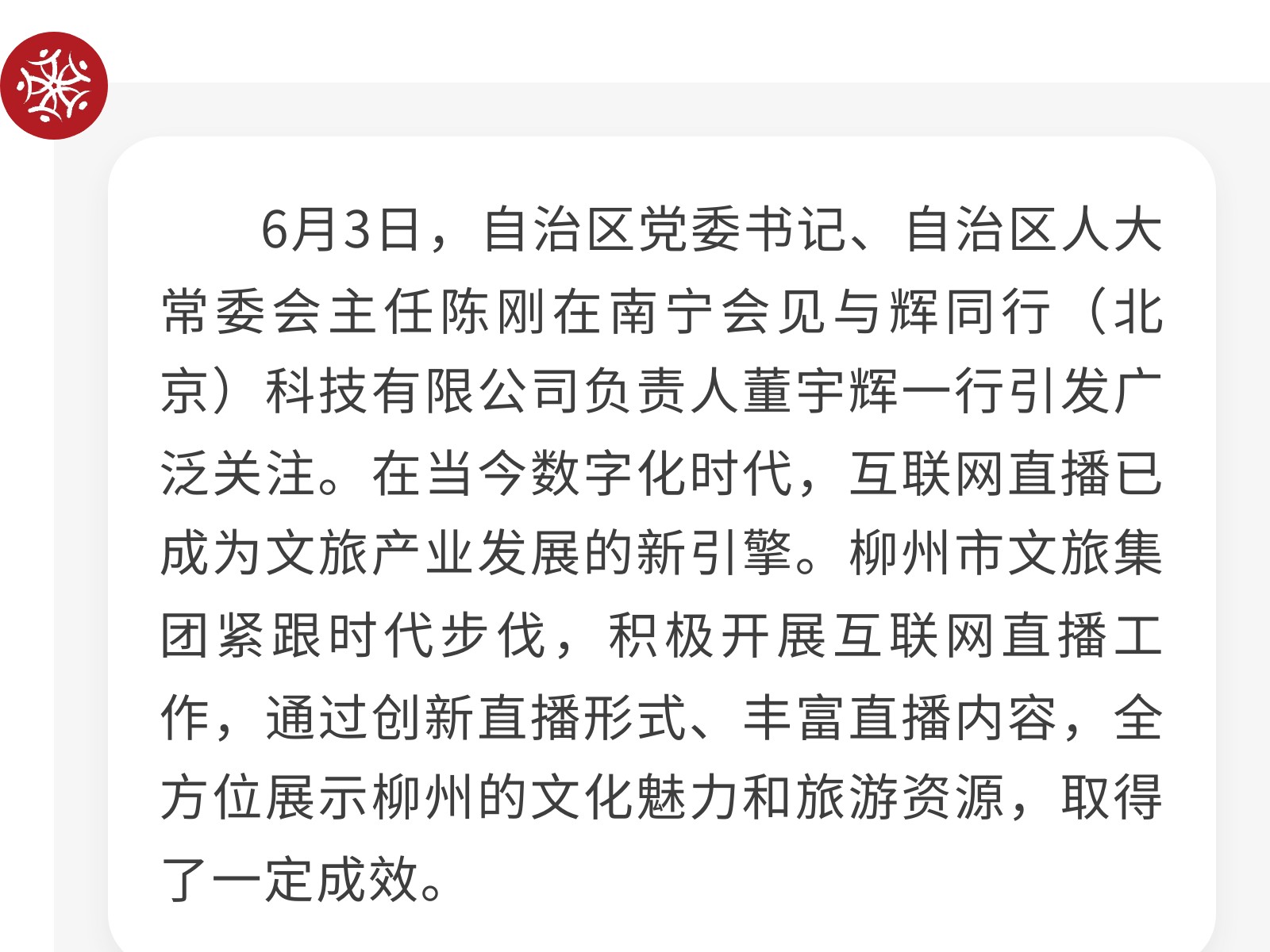 柳州市文旅集團(tuán)積極探索互聯(lián)網(wǎng)直播矩陣,助力城市文旅新發(fā)展 發(fā)布時(shí)間:2025年06月12日 20時(shí)來源:本站原創(chuàng)瀏覽:82 人次