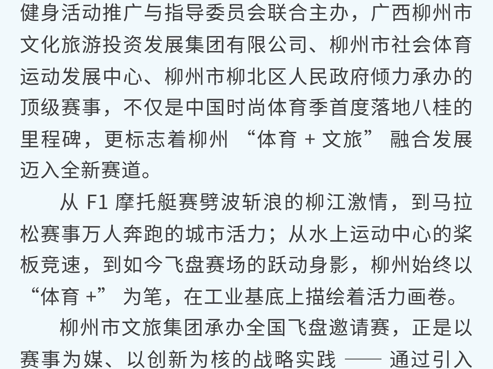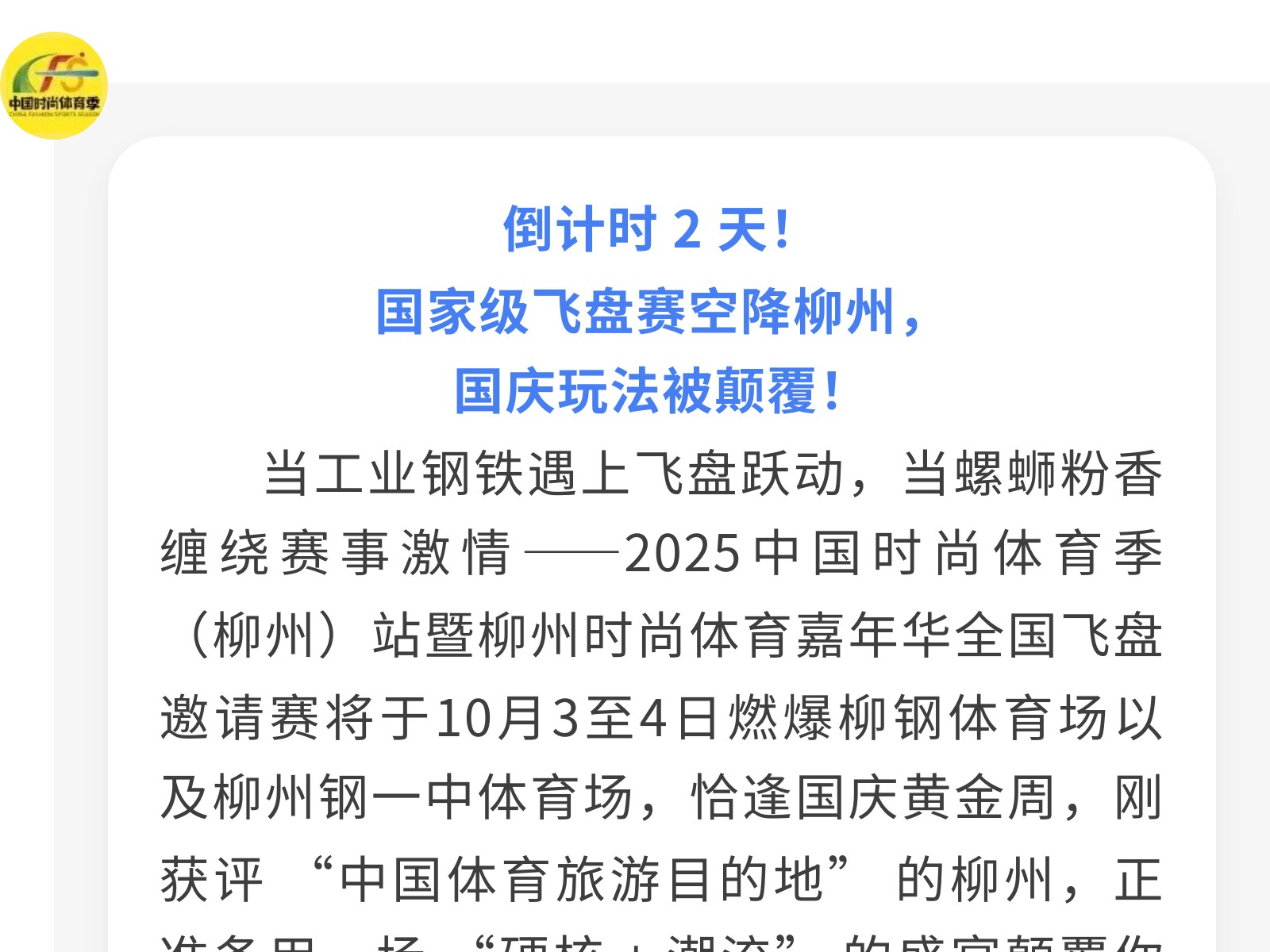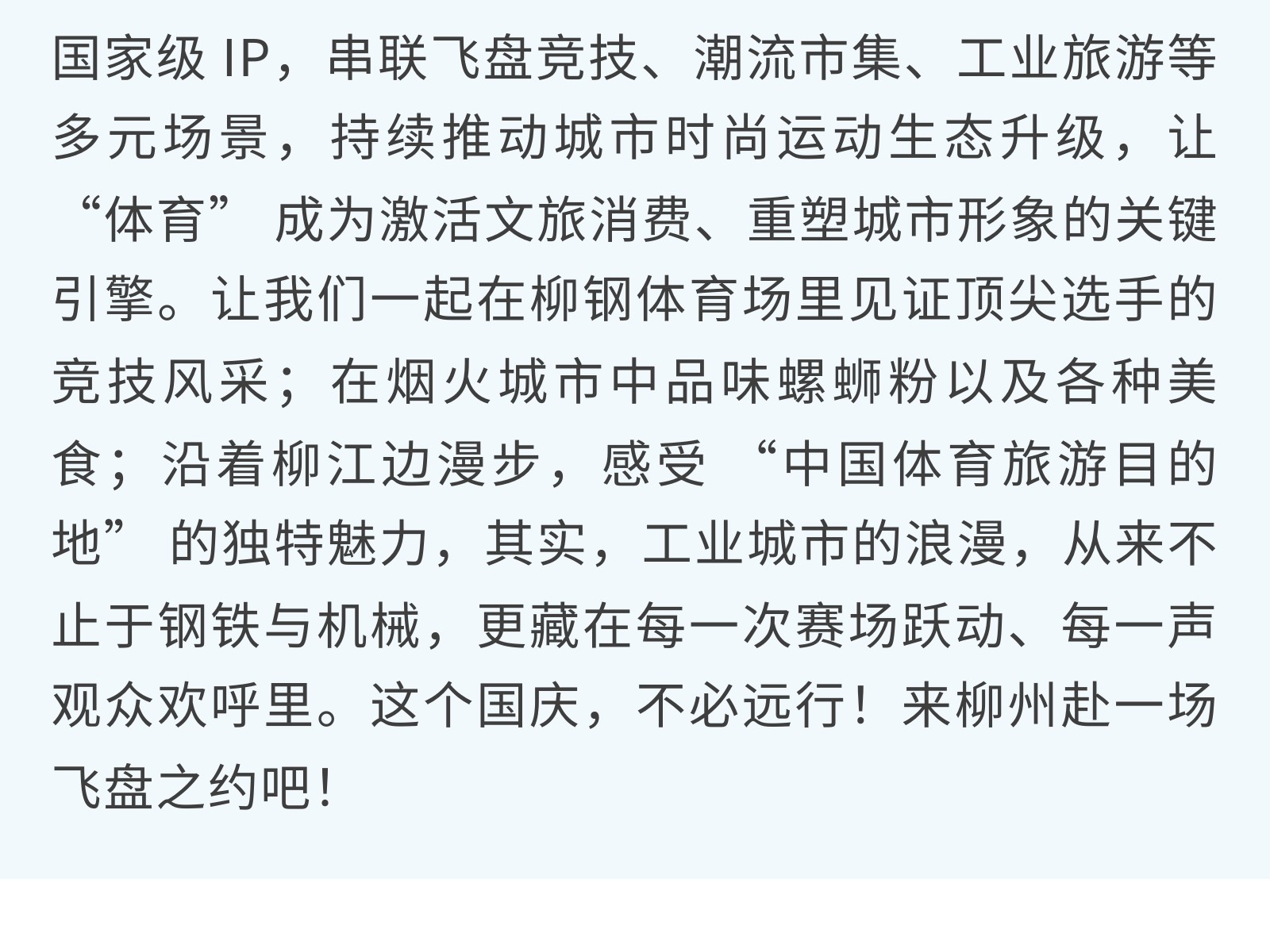 國慶赴柳!鋼鐵賽場飛盤燃,柳州這座體育旅游之城藏不住了 發(fā)布時間:2025年10月02日 17時來源:本站原創(chuàng)瀏覽:9 人次